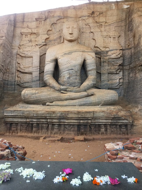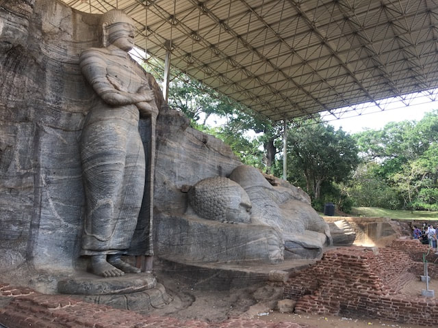 The Buddha images from Gal Vihara, are carved into the natural granite rocks. There are in a series of four and these carved Buddha images(sculptures) are over 850 years old. Still looking incredibly beautiful, serene, refined and displayed artistic excellence in execution and proportions. They featured classic Buddhist iconography, such as the depiction of Buddha’s paranibbana(a reclining Buddha image), which can be identified by the right palm beside the head and facing upwards, left foot resting over the left foot.