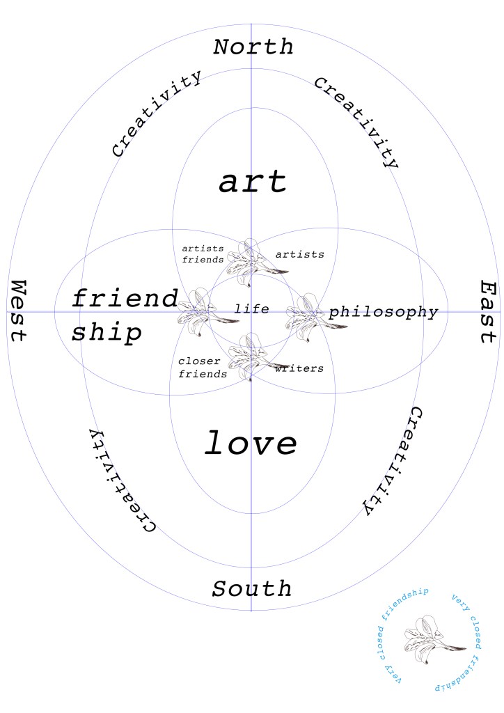 In the mind map, I try to give a certain sense of direction with the 4 cardinal directions of the earth which in a way defines part of our participation in the common world through guidance and movements. The intersections produces deeper interconnectedness and resonance through the bond of creativity. The primary bond of creativity is friendship within this exploration of the mind map. The secondary consideration is the commonality we shared in the world and the daily experiences we encounter. Creativity and reflections as such can be mediated through art, philosophy or love. It is also a commitment to ourselves that when we think about these topics, the weaving of these conceptual threads into our lives creates a kind of net or web, encompassing, strengthening and building a malleable form of structure which seeks to make coherent sense or coherent common sense that is relatable to others in bridging friendships and love.
