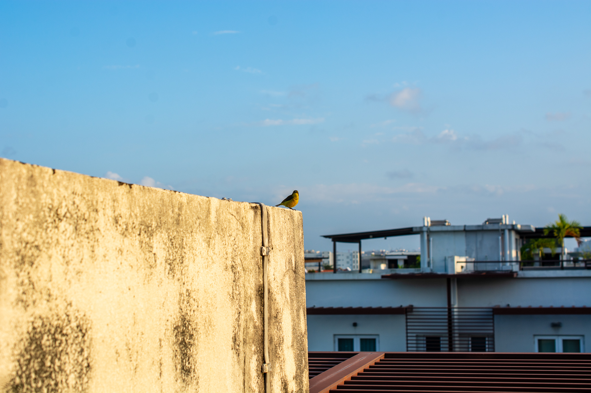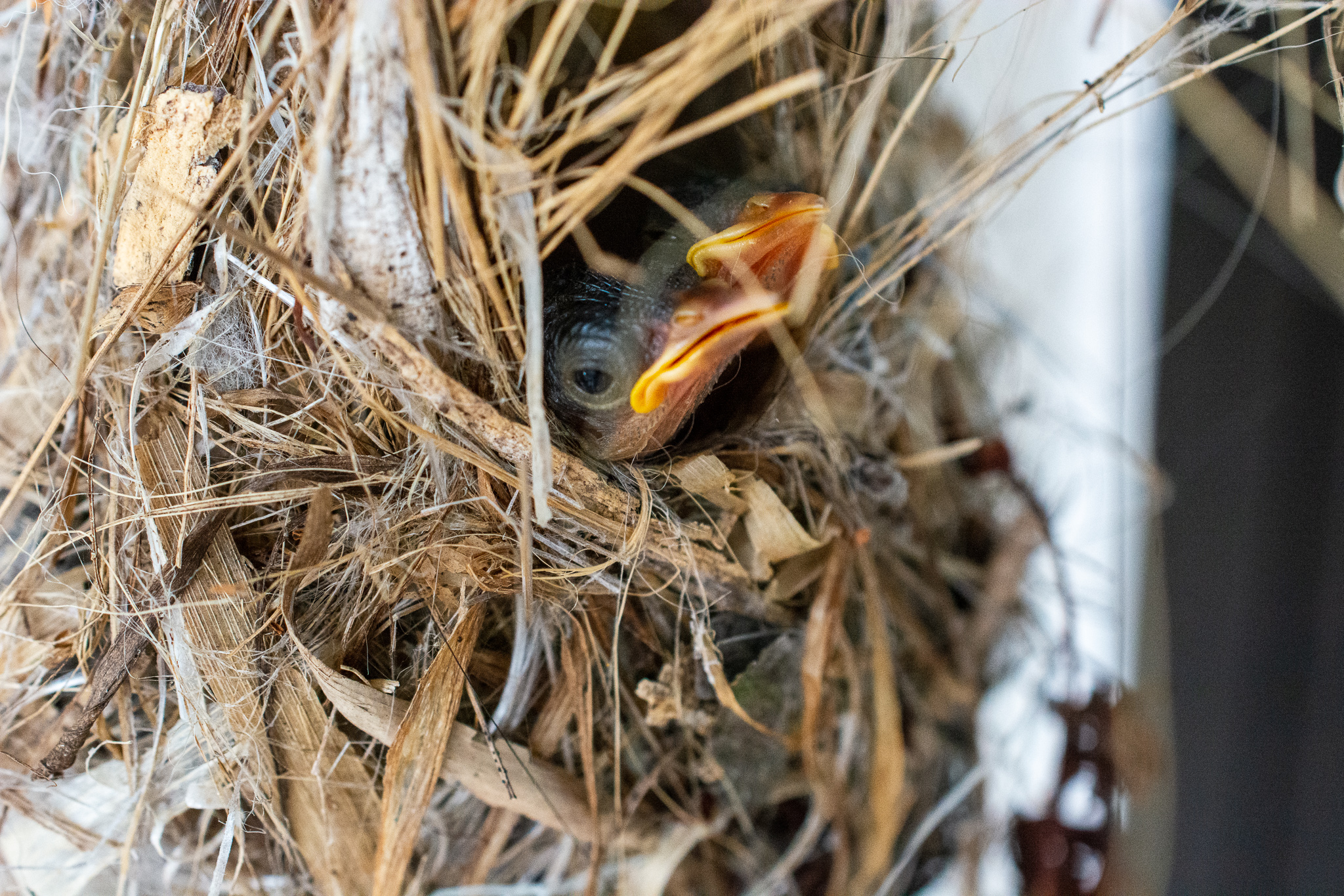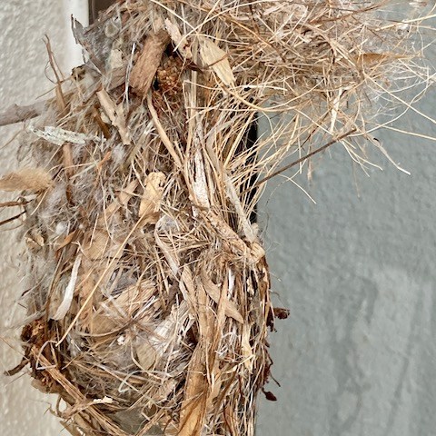 An olive-backed sunbird recently build a nest in our house. The nest has these beautiful firm contours and hanging decoration. She chose to build it on a big branch I picked and use as a home decoration with solar lights hanging on it.