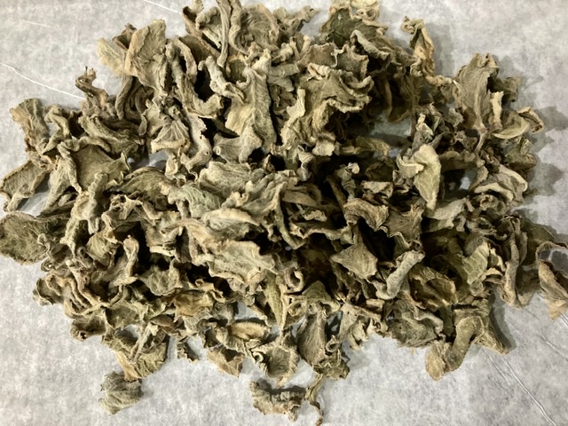 The dehydrated mint are of a rich and beautiful muted sap green colour. The texture curly, crisp and twisted like fallen dried leaves under the tree. It’s a treat to try dehydrating this plant by myself. It has given me much joy in the preparation process and end results.