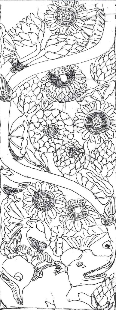 The reference image can be found at the east gateway of Stupa No 1. Below is a drawing of the actual bas relief. The original bas relief image I have reference are lotus flowers in buds and flowering stages. At the bottom, is a makara, from its mouth, came the stem of lotus flowers that extends upwards.